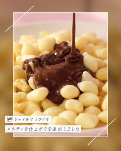 コーティングする上でのチョコレートの粘度のこだわりが、お口の中でのメルティな仕上がりを実現しました。