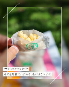 軽くて持ち運びしやすく、ひとつひとつ個包装になっているので、手を汚さずに食べられるのも嬉しいポイント✨